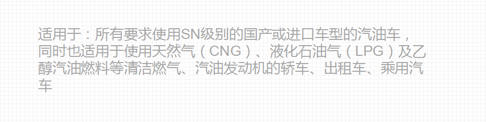 適用于所有要求使用SN級(jí)別的國(guó)產(chǎn)或進(jìn)口車型的汽油車,同時(shí)也適用于使用CNG、LNG及乙醇汽油燃料的出租車、乘用汽車。